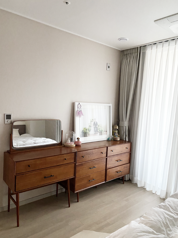 맞은편으로는 짙은 오크색의 서랍장과 화장대가 있어요