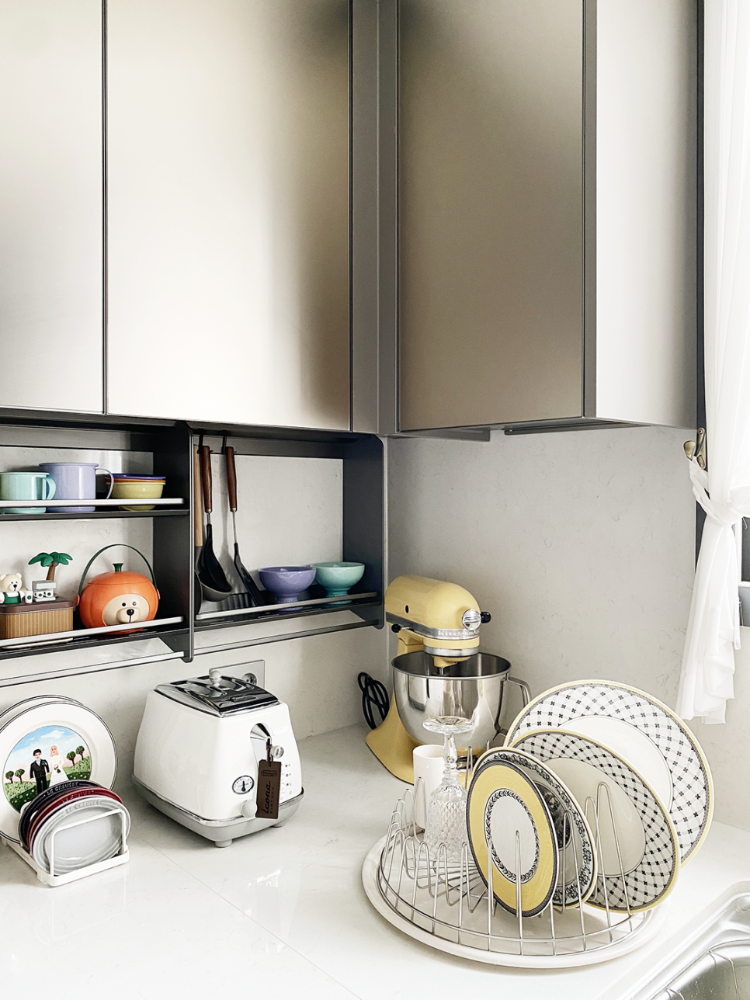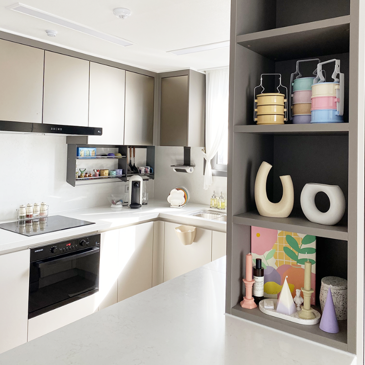 전체적으로 화이트 톤의 주방에 위에 보여지는 용품들은 알록달록한 컬러들이 많아서 지루해보이지 않는 것 같아요 😊