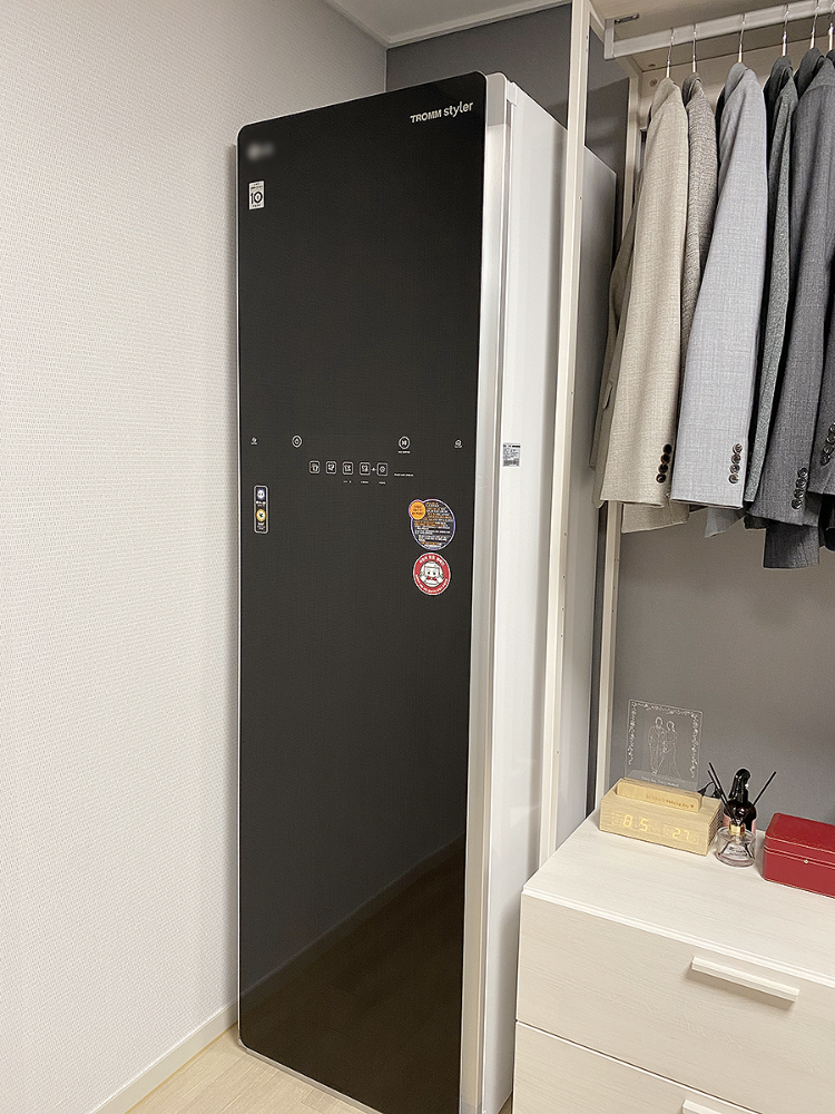직접 사이즈 재서 시스템가구로 드레스룸을 설치하니 스타일러까지 이렇게 딱 맞는 사이즈로 넣을 수 있어 깔끔하고 좋더라구요 😊