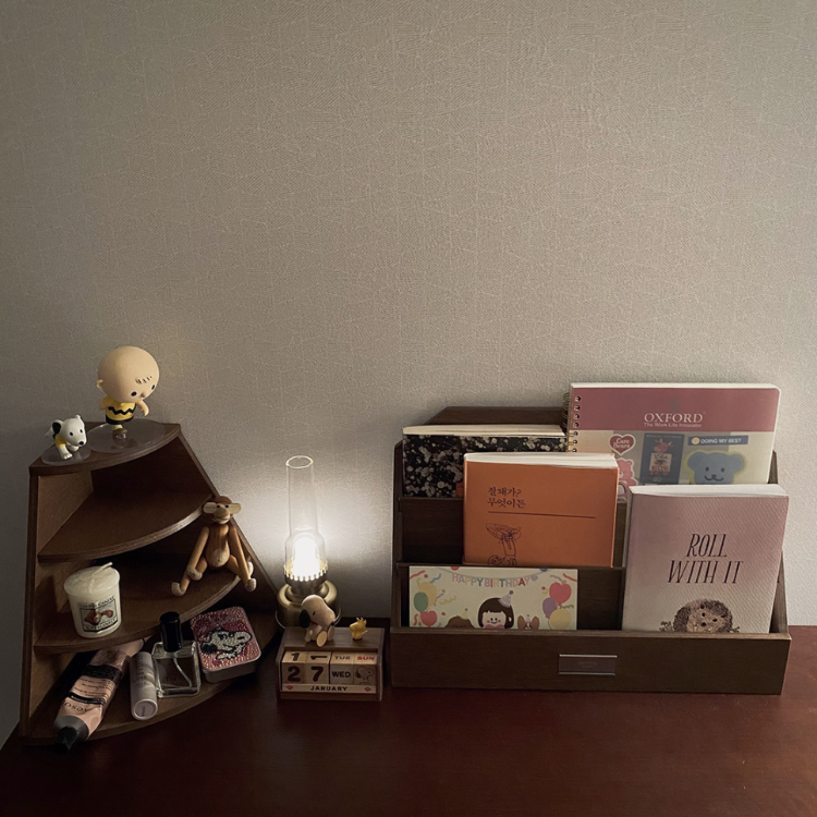 책상 위쪽에는 원목 책꽂이를 두고 그때그때 읽고 있는 책과 독서노트를 넣어두고 책을 좀 더 자주 읽을 수 있는 환경을 유지하고 있답니다. 😊 확실히 서재라는 공간이 있으니까 책도 더 많이 읽게 되고 일기 쓰면서 생각도 정리할 수 있어 정말 좋은 것 같아요.