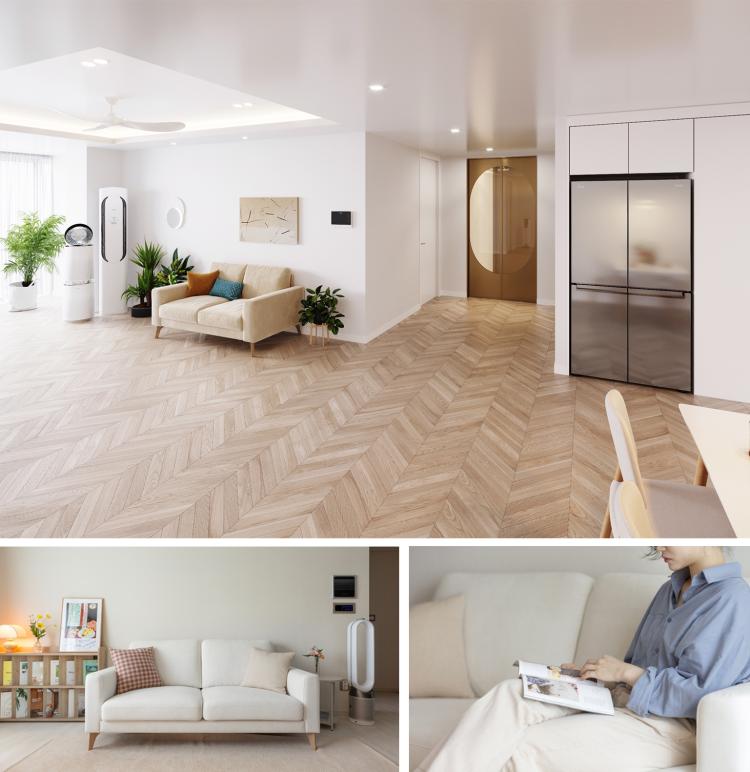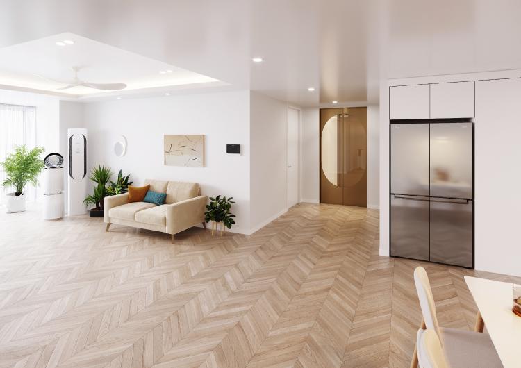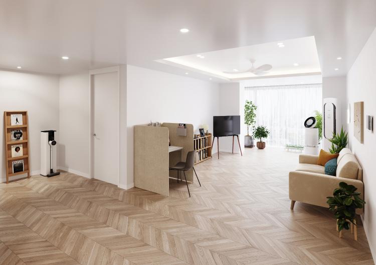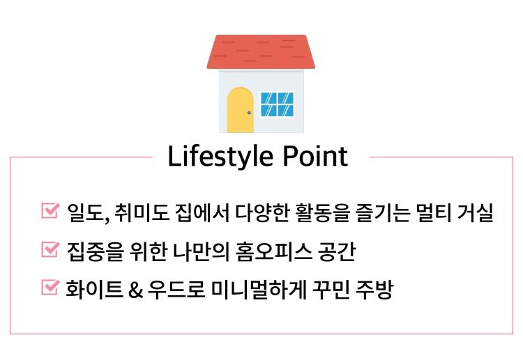 최근 집에서 머무는 시간이 길어지면서 다양한 활동을 집에서 할 수 있도록 집을 꾸미는 것이 당연한 일이 되었죠. 특히, 최근 늘어난 재택근무에도 적합하도록 집중과 휴식을 함께 즐길 수 있는 거실 공간으로 꾸몄습니다. 집에서 가장 먼저 보이는 공간인 만큼, 화이트와 우드 톤으로 전체적으로 화사하면서도 아늑한 느낌을 연출했어요. 특히, 헤링본의 바닥재로 고급스러우면서도 감성적인 느낌을 더했어요.