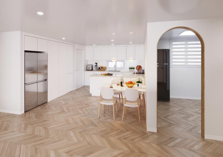 내추럴하면서도 화사한 주방 공간을 완성하기 위해서는 주방 공간을 가장 많이 차지하는 식탁의 선택이 가장 중요한데요. 감각적인 유러피안 스타일을 재현한 일룸의 비비 테이블 식탁을 선택했습니다. 화이트 컬러와 원목이 조합된 세련된 디자인으로, 공간을 환하게 밝혀주어 더 넓어 보이는 주방을 만들어 준답니다.