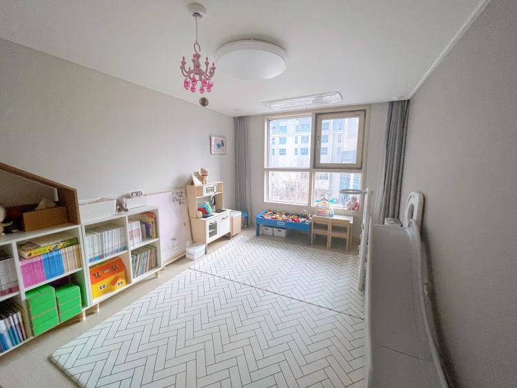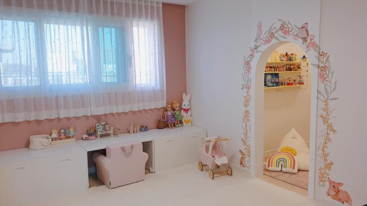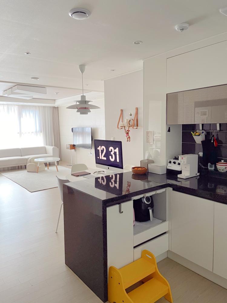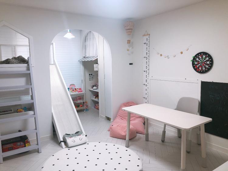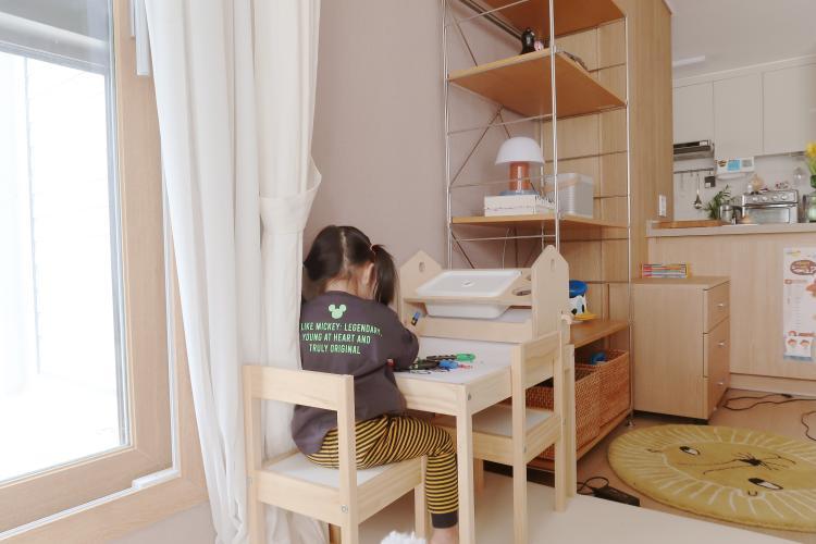 여긴 거실 뒤편인데요! 아이와 놀이공간 분리를 통해 깔끔한 거실을 유지할 수 있어요. 아이와 함께하고 싶은 마음에 만든 공간인데요, 요기서 미술놀이를 할 수 있는 책상을 두었다고 합니다:)