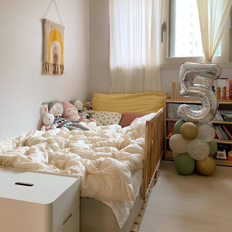 확장 가능한 가구들로 사용해 주셨고, 어머니 취향인 우드로 맞춰 배치하셨다 합니다^^마지막으로, 아이의 잠자리 독립을 위해 매트리스를 분리하여 새 침대를 만들었어요. 완벽히 독립된 아이 방이 완성되었네요!