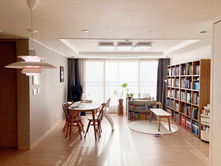 화이트&우드로 꾸며진 라이큐 고객님의 거실입니다. 아이들이 책을 사랑하는 아이로 자랐으면 하는 마음에, 손을 뻗으면 책이 닿을 수 있도록 책을 곁에 두었다고 합니다. 그러다 보니 거실의 서재화를 통해 아이가 좀 더 책에 집중할 수 있도록 해주었어요.