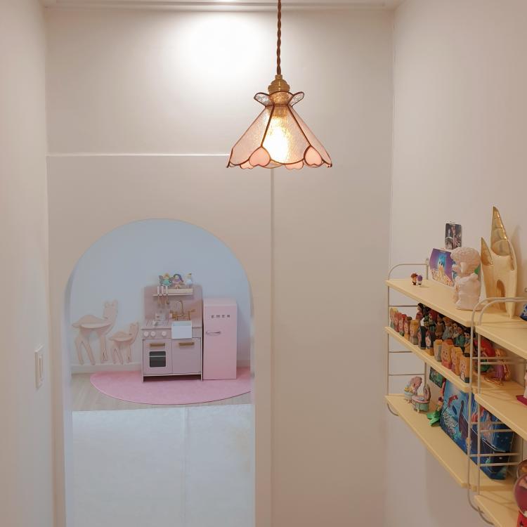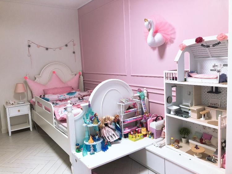 올 리모델링으로 180도 변한 방을 보여준 이내별 고객님의 아이 방을 소개합니다! 핑크를 좋아하는 딸을 위해 핑크한 러블리방으로 만들어주었어요. 해외 직구한 크라운 조명이 돋보이네요^^
