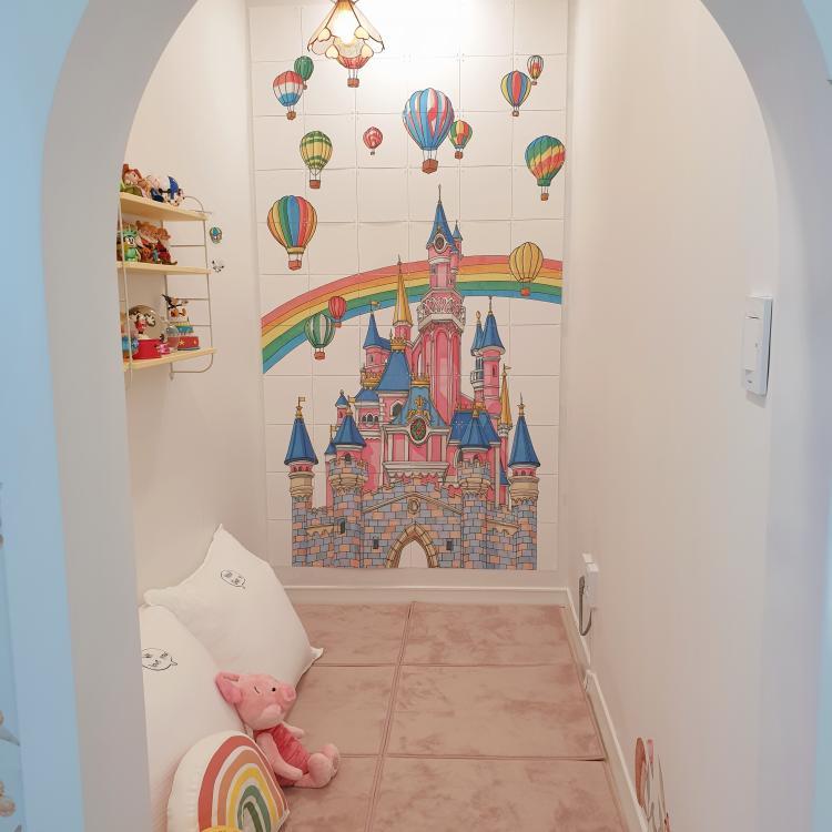 드레스룸을 아이의 놀이방으로 꾸며 알파룸을 만드셨는데요. 들어가자마자 보이는 귀여운 디즈니 성은 직접 제작을 하셨다 해요. 알파룸 분위기에 맞게 귀여운 조명과 모아두었던 디즈니 피겨들도 진열하여 분위기를 한층 더 업 시켜주었네요. 문밖에 벽지 스티커는 덤이랍니다!:)
