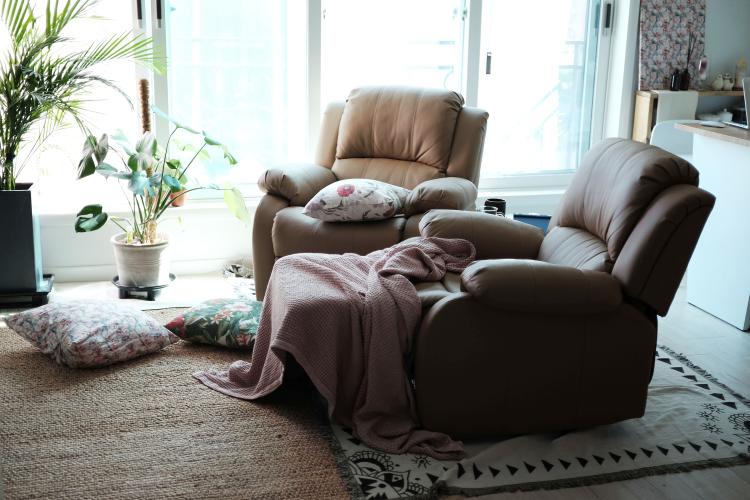 먼저, 거실엔 제가 요즘 들어 가장 좋아하는 가구가 들어와있답니다. 처음 신혼집을 꾸밀 때는 투박하고 덩치가 큰 리클라이너 소파는 생각도 하지 않았어요. 헌데, 어느 날 문득 본 리클라이너 소파는 재질이며 색감이며 투박하고 못난 소파가 아니라 충분히 내가 원하는 인테리어의 포인트가 되어 줄 수 있는 디자인으로 출시되고 있더라고요. 때마침 3인용 소파가 푹 꺼지기 시작했고, 리클라이너 소파를 집으로 들였답니다.