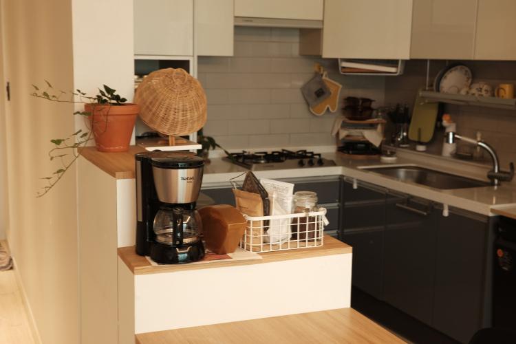 그 옆으로 거실과 이어지는 주방은, 참 아기자기하게 작아요. 그래서 다양하게 꾸민다기보다 공간정리를 하며 살고 있답니다. 애매한 구조의 주방이라 통로와 주방 사이 가벽을 두고 조금 더 깊이 있게 주방 공간을 사용하고 있어요. 가벽을 선반 형태로 짜맞추어 공간을 구분하고 물건들을 수납하는 두가지 용도로 사용합니다