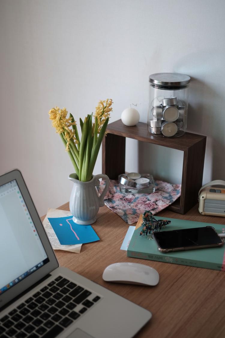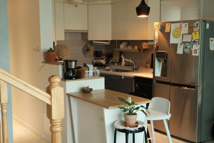 주방이 작아 아쉬웠던 점 중 하나는 식탁의 부재랍니다. 식탁을 두고 싶었으나 공간이 부족하여 식탁을 두진 못했어요. 그래서 따로 식탁을 두기보다는 아일랜드 식탁을 나의 데스크로 조리대로, 식탁으로 활용하고 있답니다.