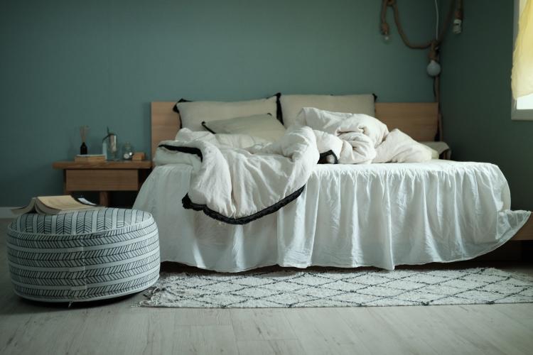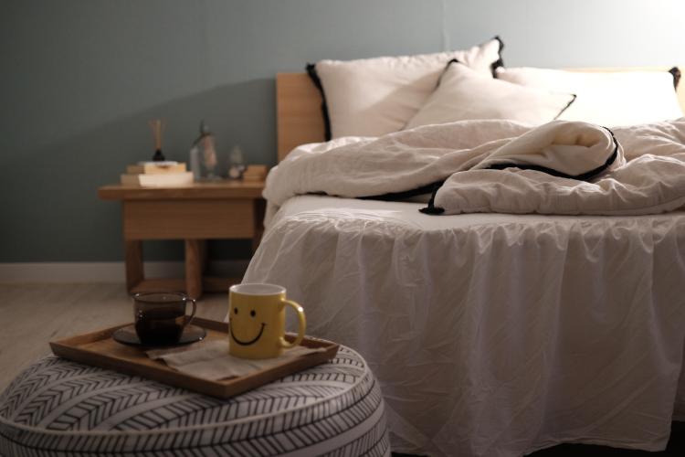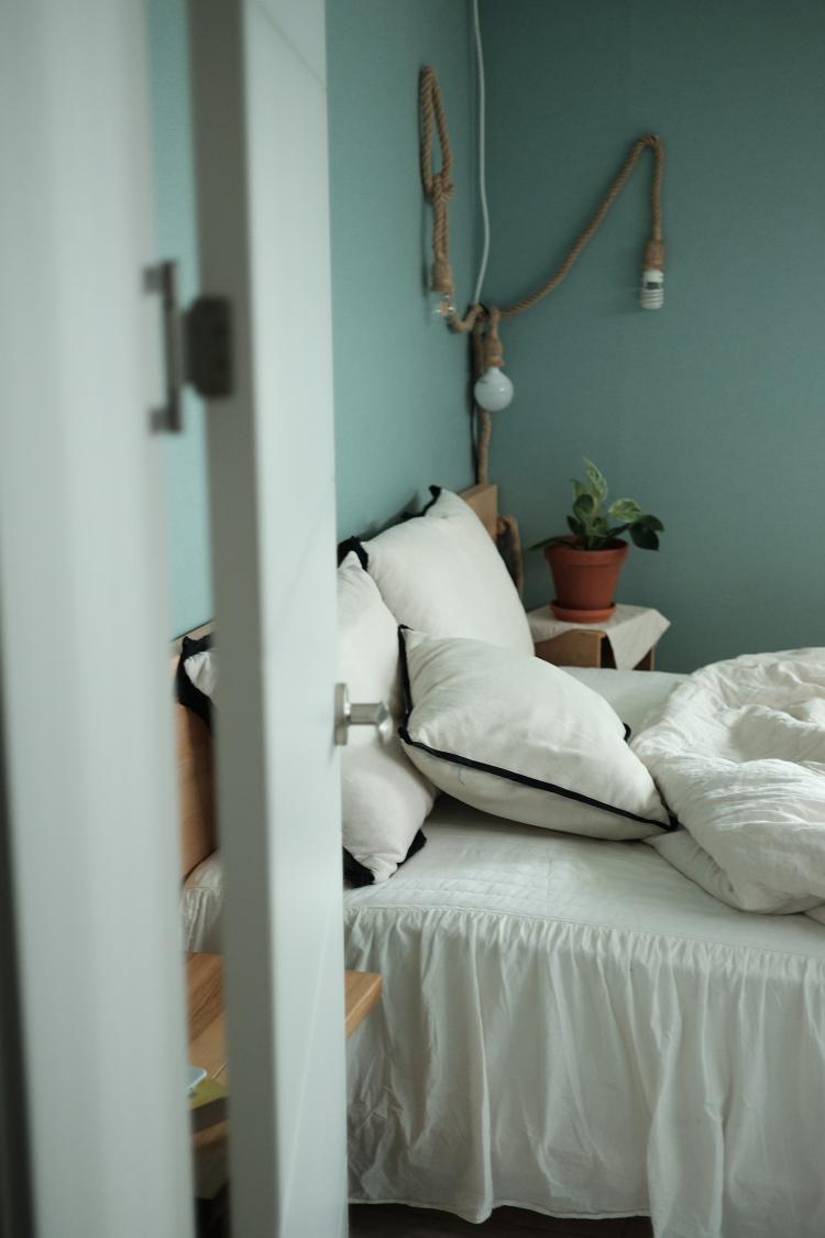 따뜻하고 여유로운 공간이고 싶었던 침실에는 포근한 광목 침구와 조명으로 꾸며봅니다.