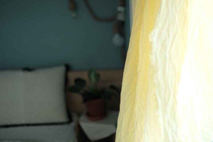 광목 원단 특유의 색감과 까끌까끌하지만 부드러운 촉감은 저희 집 침실에 딱이랍니다. 그리고 라탄 소재의 로프 조명으로 침실을 위트 있게 연출했어요.. 벽에는 꼭꼬핀으로 고정을 하고 로프 조명을 달아 침실 조명을 완성했어요. 전구의 형태는 각각 다르지만, 전구의 색은 따뜻한 전구색이랍니다.