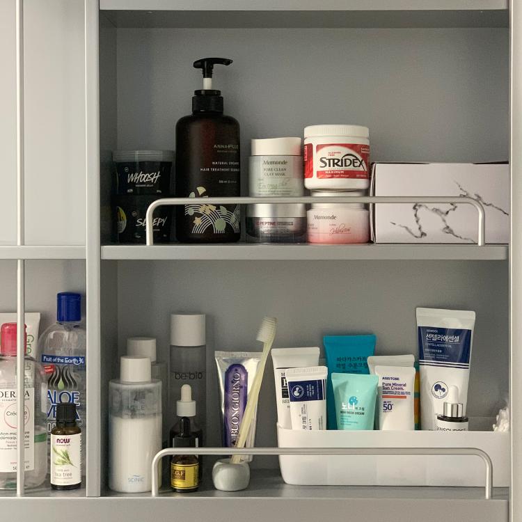 집에 있는 시간이 많아지면서 화장품들은 화장실 수납함으로 쏙 넣어둔답니다:)