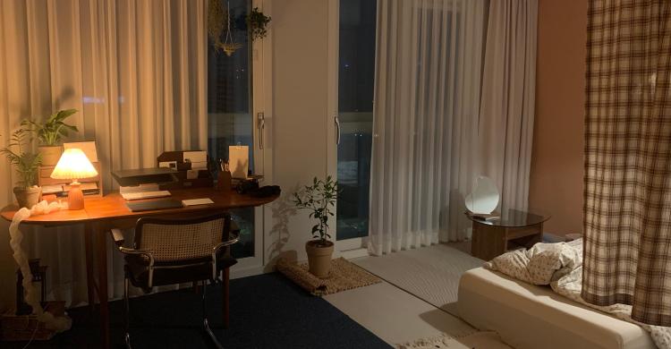 오피스 공간은 물건이 많지만 침실 공간은 물건을 최소한으로 줄이고