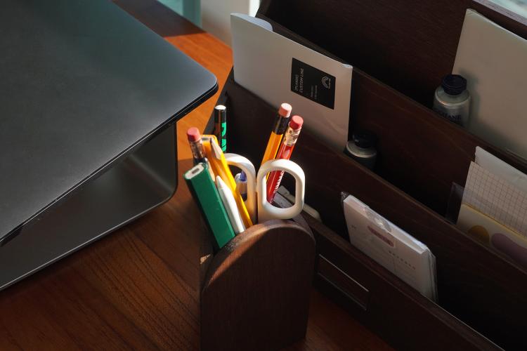 일 할 때 사용하는 필기구와 종이들은 수납함에 보관하고 있습니다.