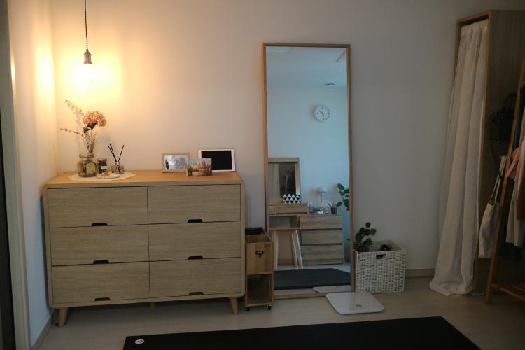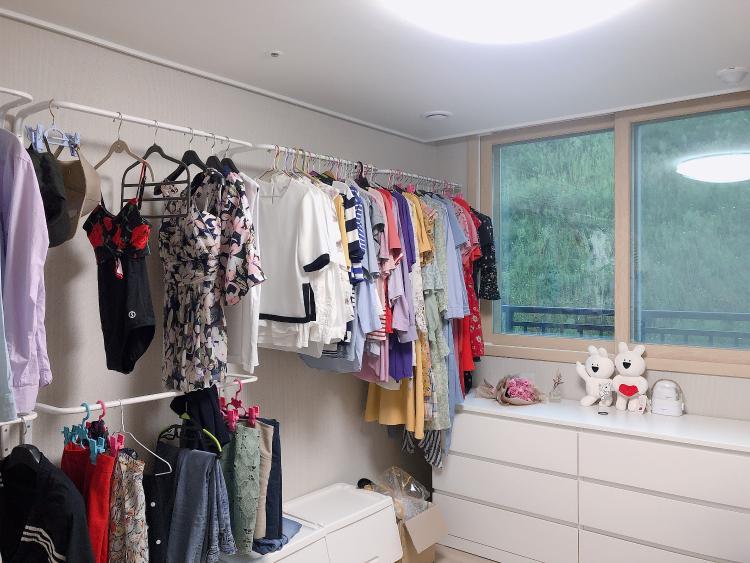 이전에 살았던 집에는 옷장이 있었는데 집이 너무 답답해 보여서 이번 집에는 옷장을 들이지 않고 대신 베란다에 봉을 설치해서 부족한 옷 수납을 해결하셨다 합니다:) 나만의 드레스룸이 너무 부러워요