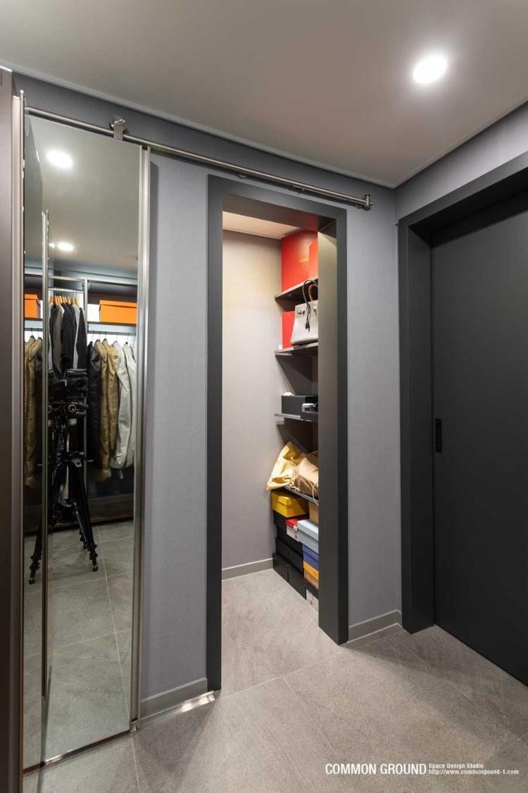 마지막 외출 전 마지막 패션 점검을 위해, 드레스룸의 도어를 슬라이딩 거울 도어로 제작하는 센스도 보여주셨습니다.