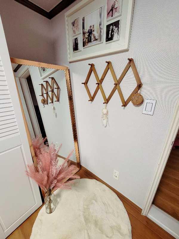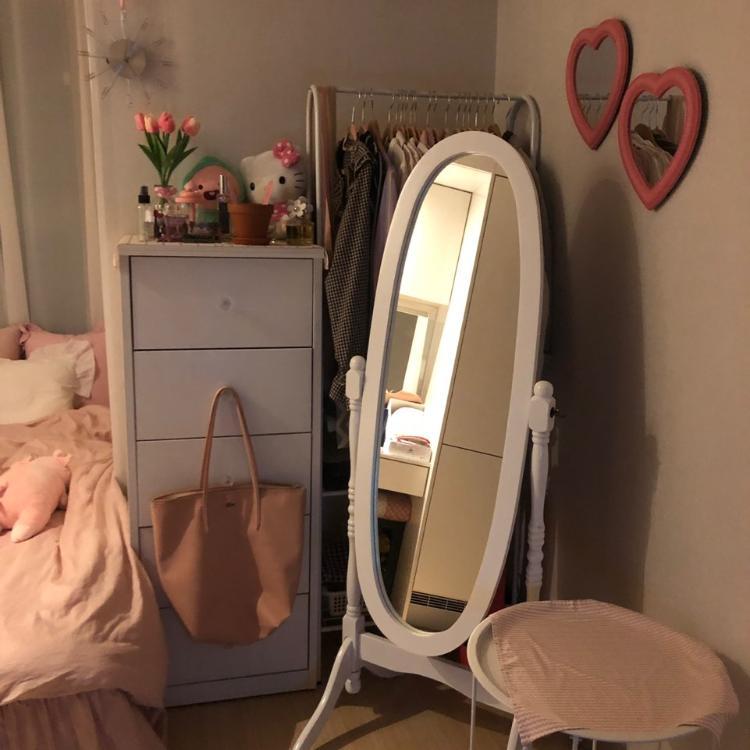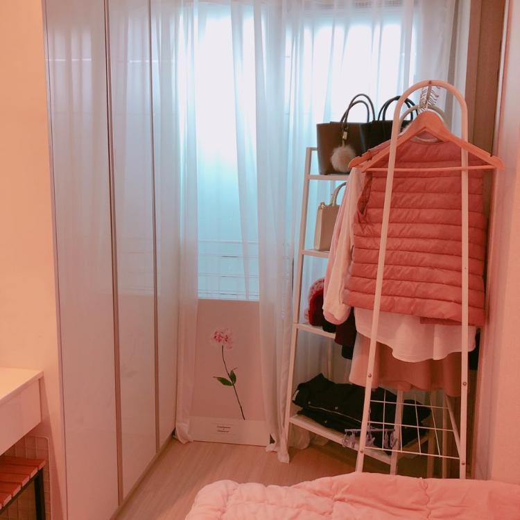 핑크를 무척 좋아하시는 SIYOMI 님의 집입니다. 다양한 소품들을 활용하여 드레스룸을 꾸며 주셨어요! 창가 쪽에 행거와 선반을 두시고, 한 곳에서 붙박이장-행거-선반을 이용할 수 있게 미니 드레스룸처럼 꾸미셨네요. 동그란 화이트 전신거울이 포인트 랍니다:)