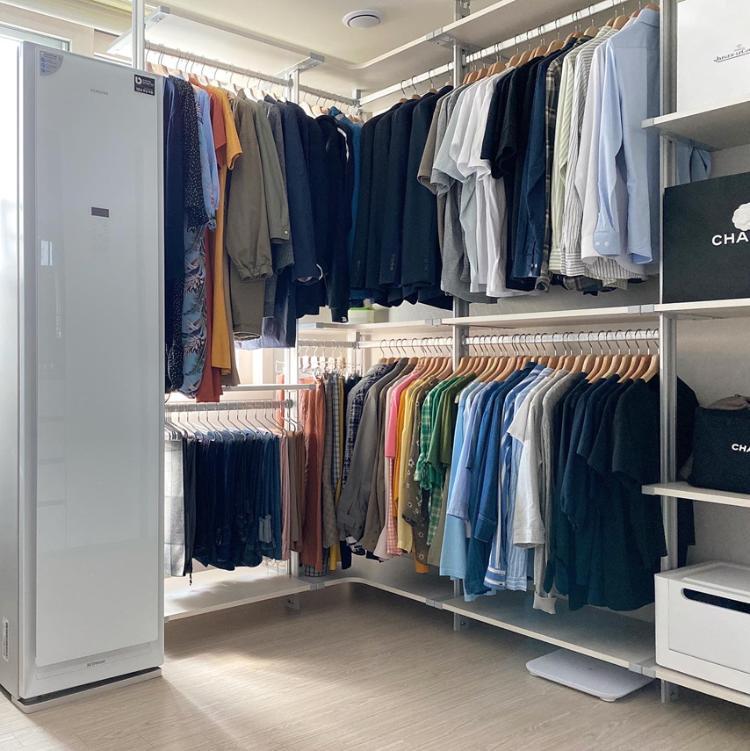 마지막으로 스타일러와 함께 드레스룸을 배치하신 일사공일부부님의 드레스룸입니다! 한눈에 딱 들어오는 드레스룸을 좋아하신다하는데요. 컬러 별로 옷들이 정리된 모습이 가장 보기 좋다고 합니다. 흰색으로 이루어진 스타일러와 시스템행거가 마치 하나의 세트인냥 배치되어있는데요^^ 이런식의 가전과의 배치로 드레스룸을 꾸며보는 것도 추천드립니다!