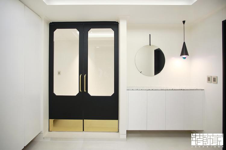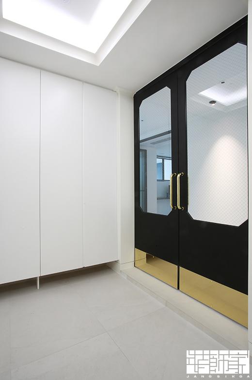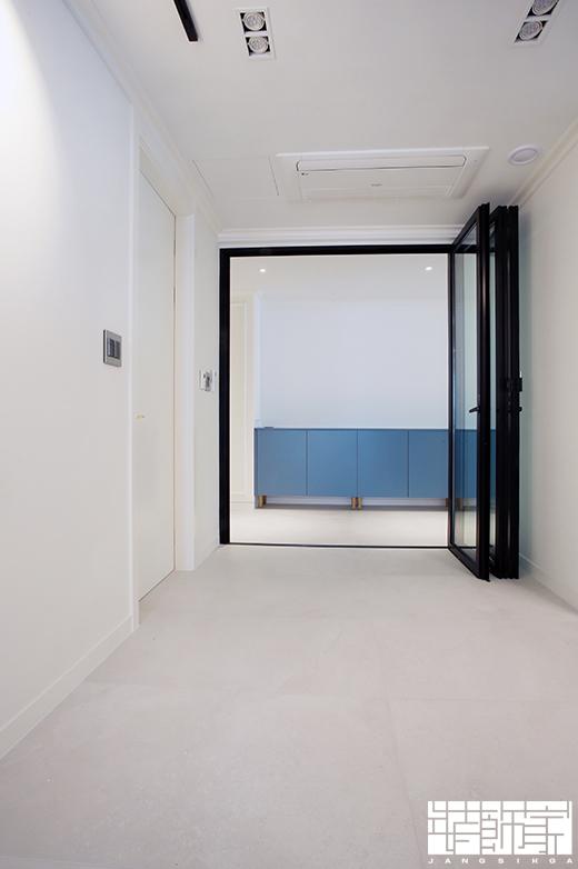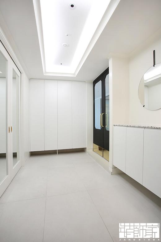 가장 먼저 만나볼 공간은 현관입니다. 현관은 모던한 디자인을 기본으로 한 개성있는 포인트가 돋보이네요! 거울이나 중문 프레임의 다양한 형태를 공간에 적절히 배치하여 현대적인 분위기를 연출한 현관에 재미를 주었습니다.