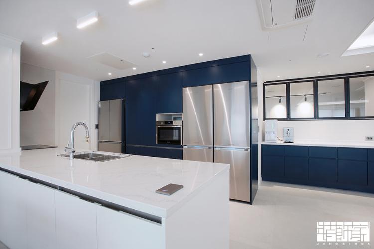 블루 키큰장과 화이트 아일랜드로 시원하면서도 심플한 분위기를 연출한 주방입니다. 주방에는 벽부형 후드를 설치하여 주방이 더욱 깔끔해 보이도록 하였습니다.