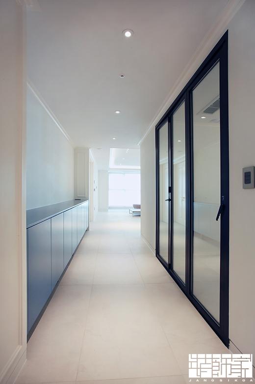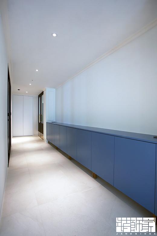 현관과 거실을 이어주는 복도의 한쪽 벽면에 긴 수납장을 설치했습니다. 맞춤 수납장으로 넉넉한 수납이 가능한 실용적인 복도가 탄생했네요! :)