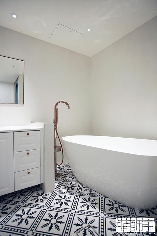 유니크한 패턴 타일과 로드 골드 포인트가 눈길을 끄는 안방 욕실입니다. 특히 욕실 수전부터 욕실 악세사리, 수납장 손잡이까지 디테일한 포인트가 돋보입니다.