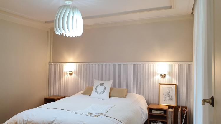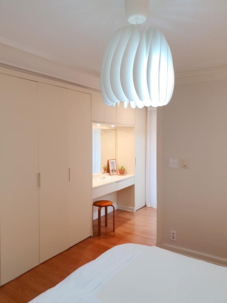 그중 눈에 띄는 천장 등은 꽤 큰 것으로 골랐어요. 침대 위에 설치되어 있어서 머리 부딪힘 없이 사용할 수 있고 침실의 고급스러운 분위기를 더하는데 한몫하는 것 같아요.