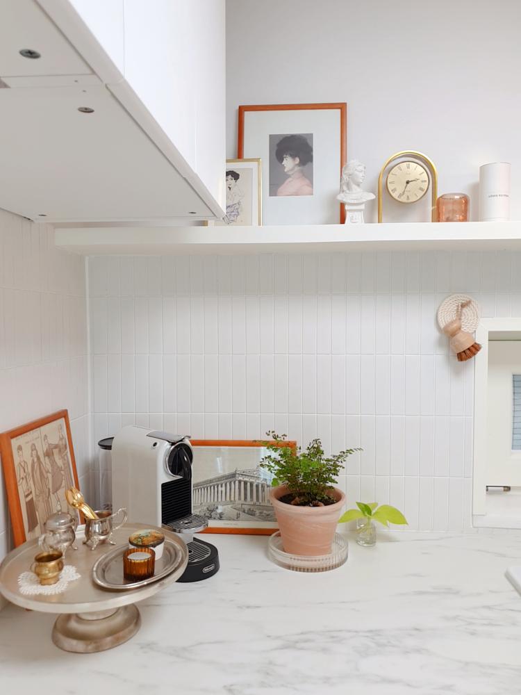상부장의 일부를 과감히 없애고 선반을 짜 넣었어요 선반에는 주방에서 쓸법한 물건이 아니라 제가 여행을 다니면서 모은 소품 혹은 기념품들이 데코 되어있어요.