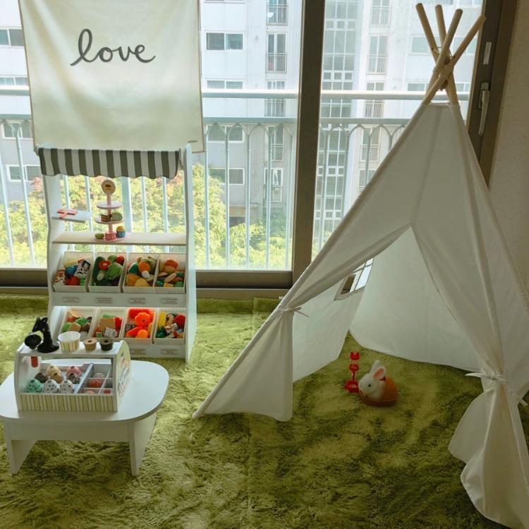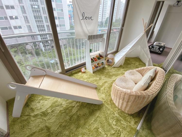 또한 잔디 러그를 깔아 키즈카페 같은 새로운 공간으로 변할 수도 있습니다. 층간 소음 걱정 없이 마음껏 뛰놀 수 있도록 만드셨다합니다:)