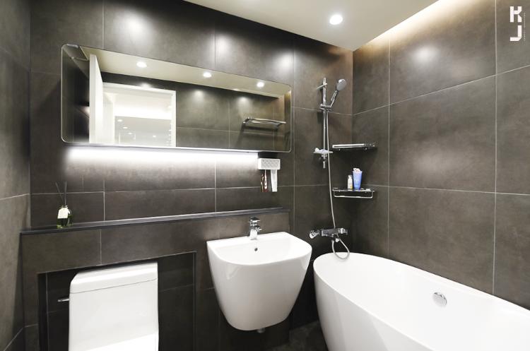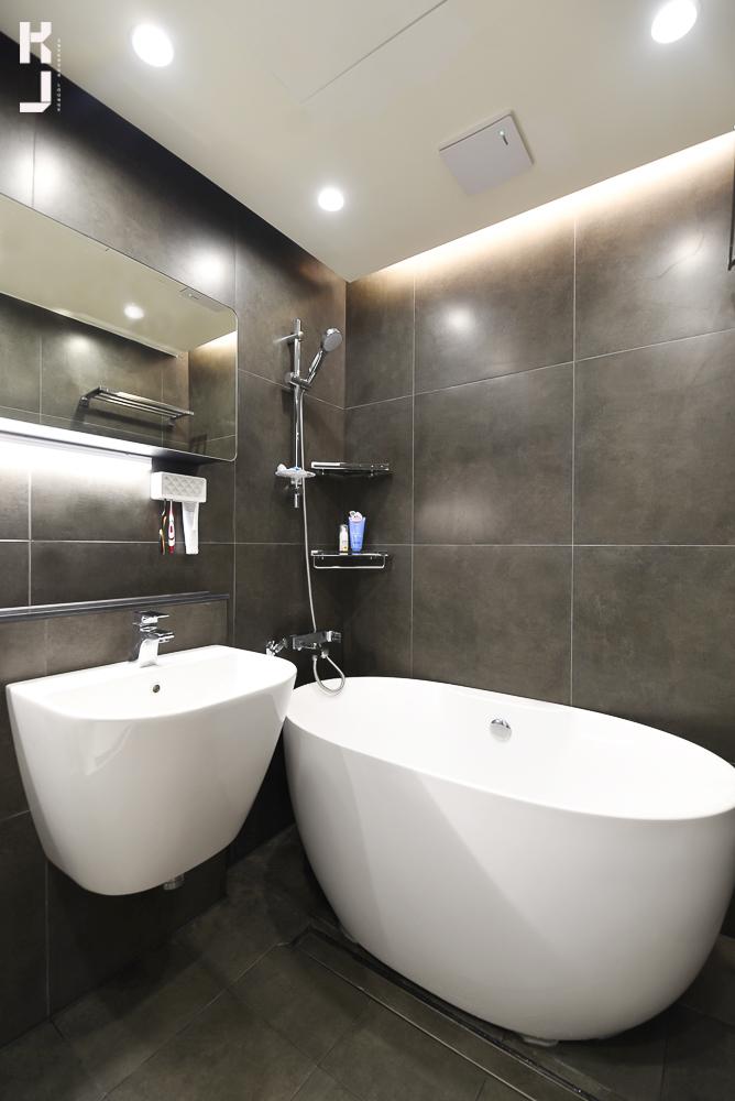 다음은 욕실이에요. 다크한 그레이톤의 타일로 벽과 바닥 모두 통일했고, 곡선의 미가 있는 라운드 세면대와 변기를 시공!
