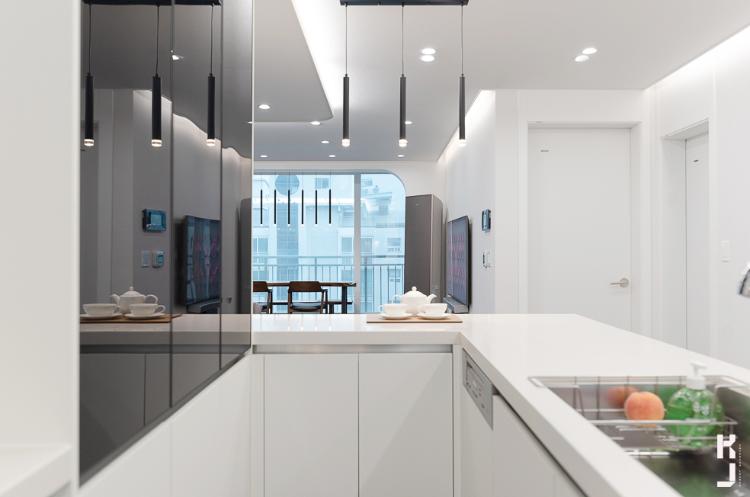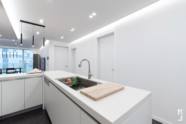 중국 음식을 자주 해 드시는 클라이언트님의 라이프스타일에 맞게 후드는 후드구멍에서 최대한 가깝게! 후드자리는 옮기지 않고, 냉장고만 좌측 벽에 위치, 개수대와 조리대는 아일랜드에 위치시켜서 조금 더 유니크한 부엌으로 거듭났어요. 사각 싱크볼과 스완 수전 그리고 넓직한 조리대까지!! :)
