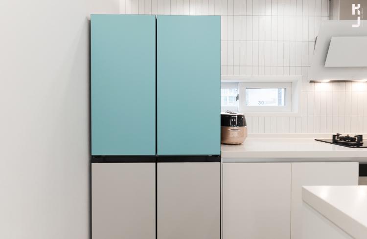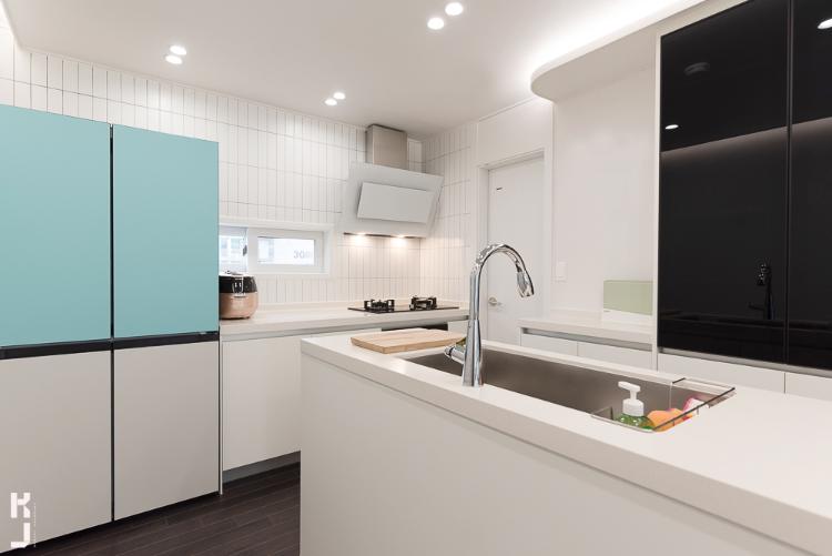 부엌에 활기를 불어넣어준 삼성 비스포크 냉장고! 요즘 신혼분들에게 인기만점이죠 ㅎㅎ 직접 초이스하신 컬러 민트&화이트♡ 그리고 화이트 후드와 화이트 타일이 아주 깔끔하죠?