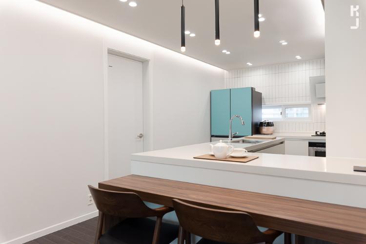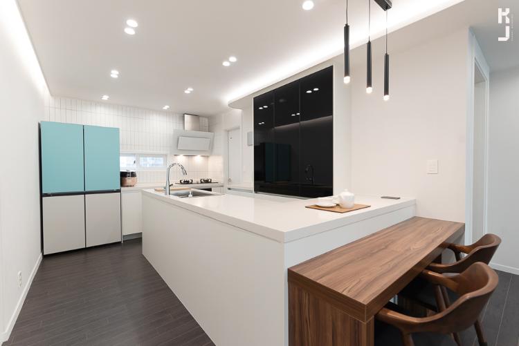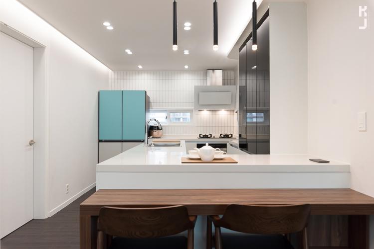 기존 주방은 'ㄱ'자 주방이였는데 수납력을 높이고 디자인을 고려한 알찬 구성의 'ㄷ'자형 부엌으로 구조를 변경했습니다.