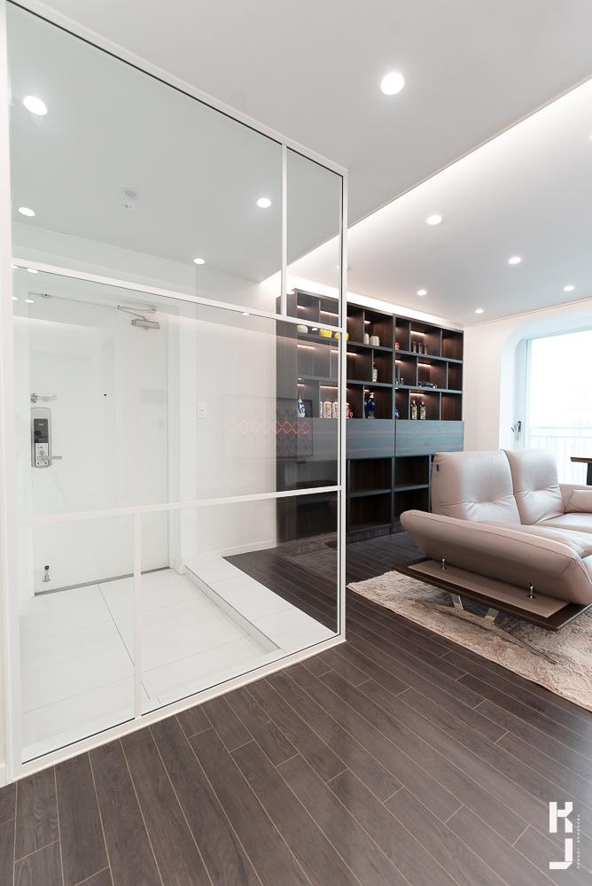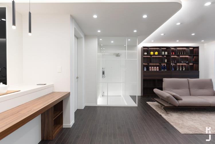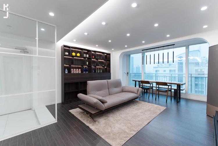 강변래미안 현장은 기존 천장을 모두 철거하고 천고를 더 높였어요! 이 아파트는 우리나라 30평대의 아주 기본적인 구조를 갖고 있엇는데요, 구조의 변화를 주기 위해 현관 입구 방향을 바꾸고 쇼파를 앞당겨 위치한 뒤 쇼파 뒷면에 포인트 책장을 놓았습니다 ㅎㅎ