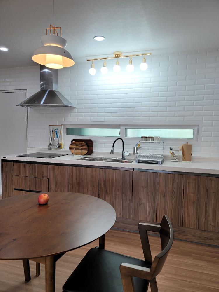 주방 상부장이 없는 대신 벽이 심심해 보이지 않도록 입체감 있는 타일을 붙이고 갓모양 후드를 달았어요. 금빛의 5등도 예쁜 포인트가 되어준답니다.