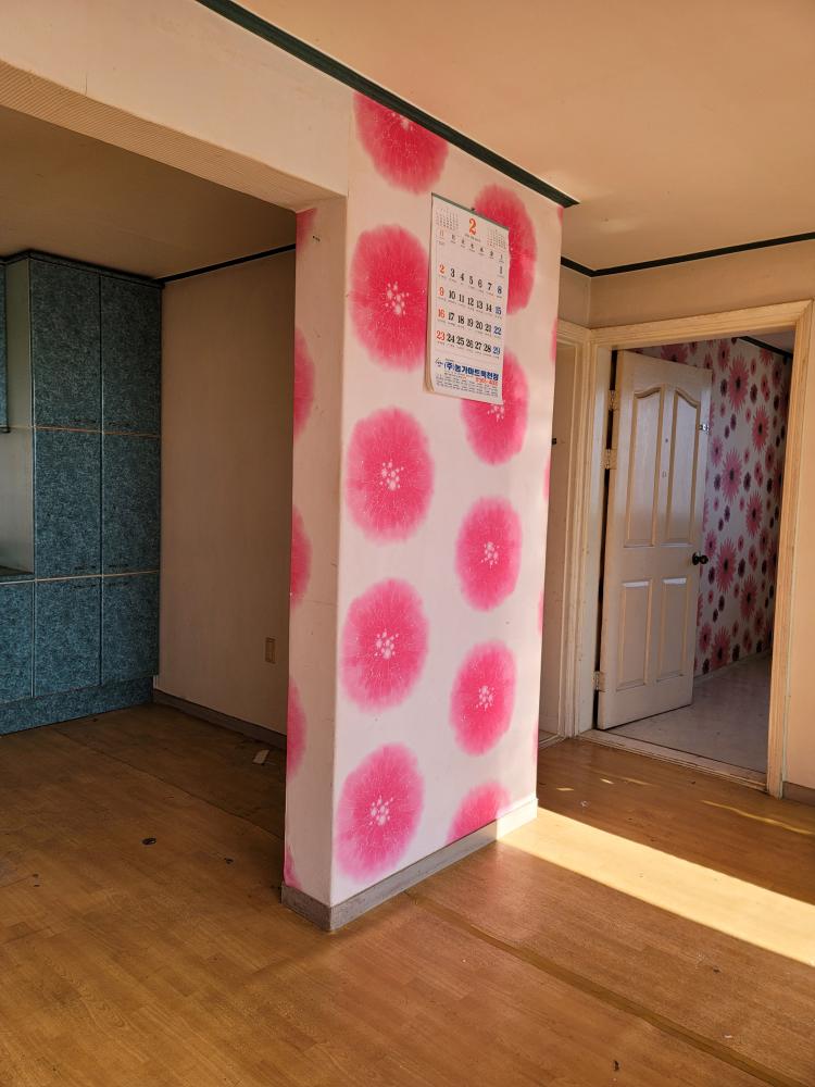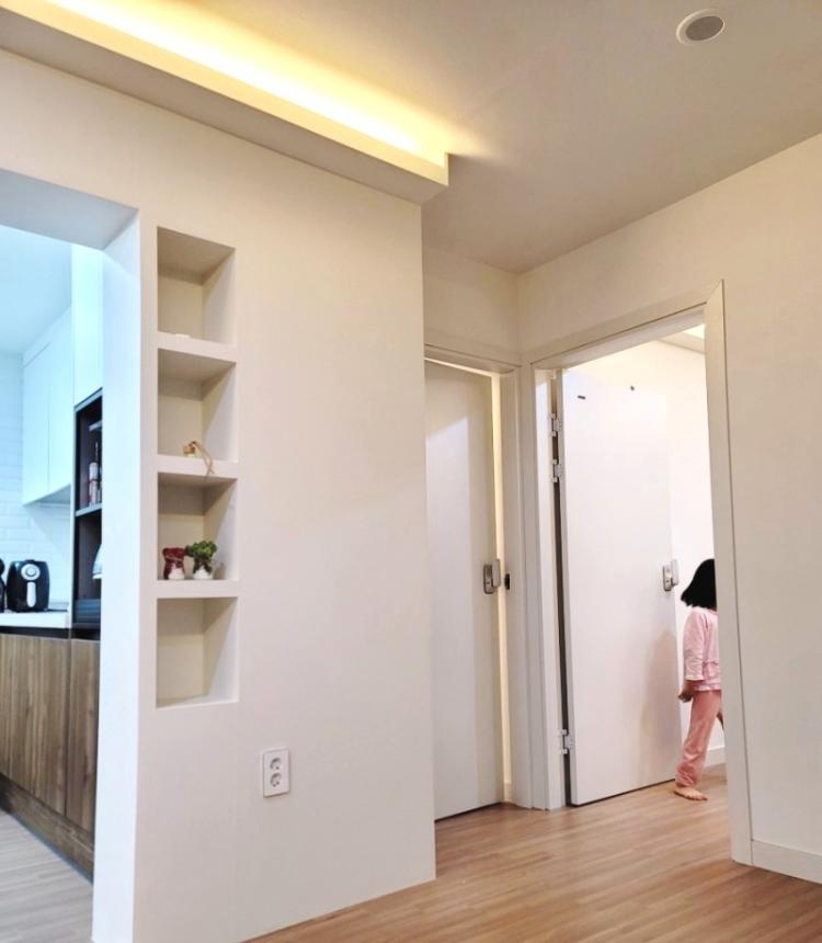 분홍색 꽃무늬 벽이었는데, 답답해 보여서 없애고 싶었지만 내력벽이라 철거가 불가능했어요. 그래서 최대한 답답함을 없애려고 흰색 선반으로 변신시켰답니다.