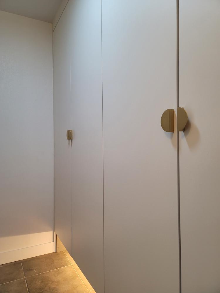 현관문을 열고 들어가면 하얀색의 신발장이 보여요. 반달 모양의 금빛 손잡이가 아주 마음에 들어요. 바닥은 모카색의 타일을 붙였습니다.