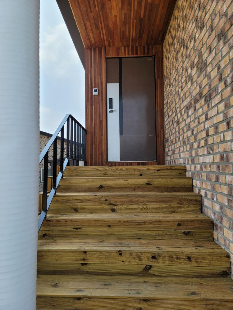 현관으로 들어가는 입구는 대리석 계단이었지만 마당에 깔린 데크와 맞추어 보았어요.