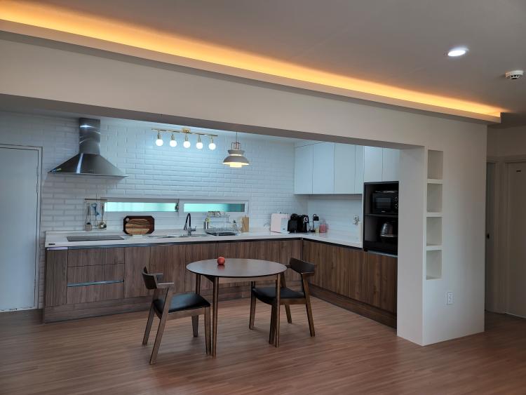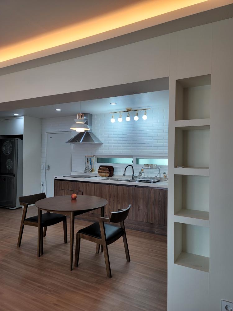 원래부터 주방은 긴 편이었어요. 긴 대신 넓지는 않아서 전에 쓰던 6인용 식탁을 넣기엔 무리였어요. 그렇다고 식탁이 없으면 제가 너무 불편할 것 같아 2인용 티 테이블을 두었어요.