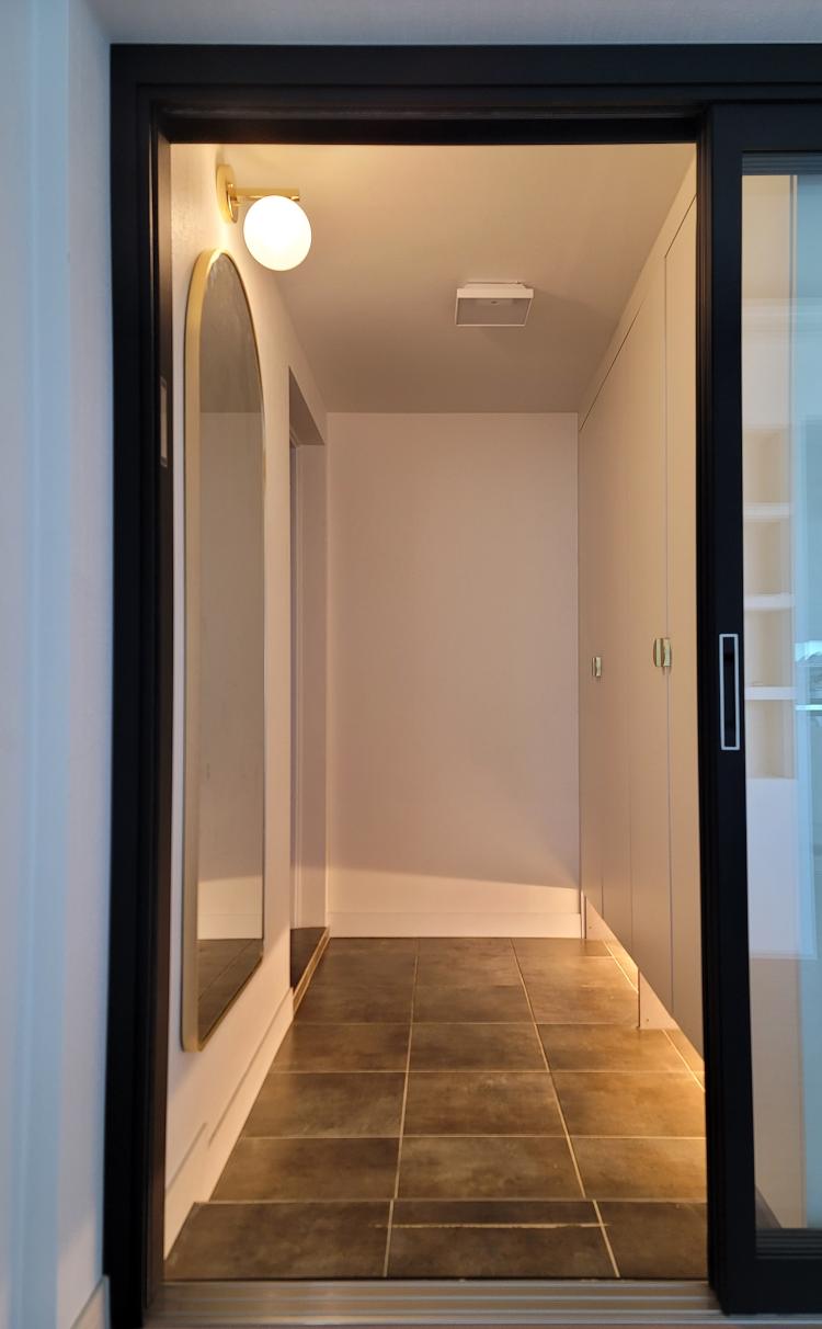 현관은 금빛 테두리의 전신거울과 금빛 조명이 포인트에요. 저는 풍수 인테리어는 신경 쓰지 않는 편인데요. 남편은 집으로 들어오는 입구에 황금빛이 있는 걸 좋아하더라고요.