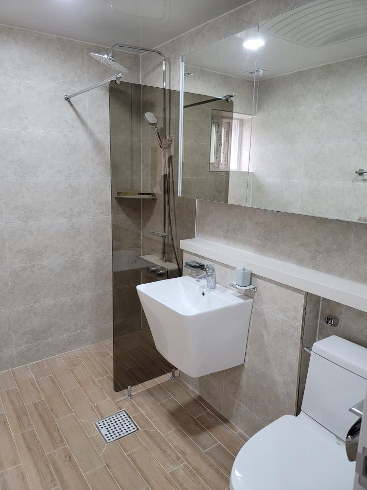 이곳은 기존에 있던 거실 화장실이에요. 화이트 벽과 문에 어울리는 색의 타일 무늬로 선택했어요.