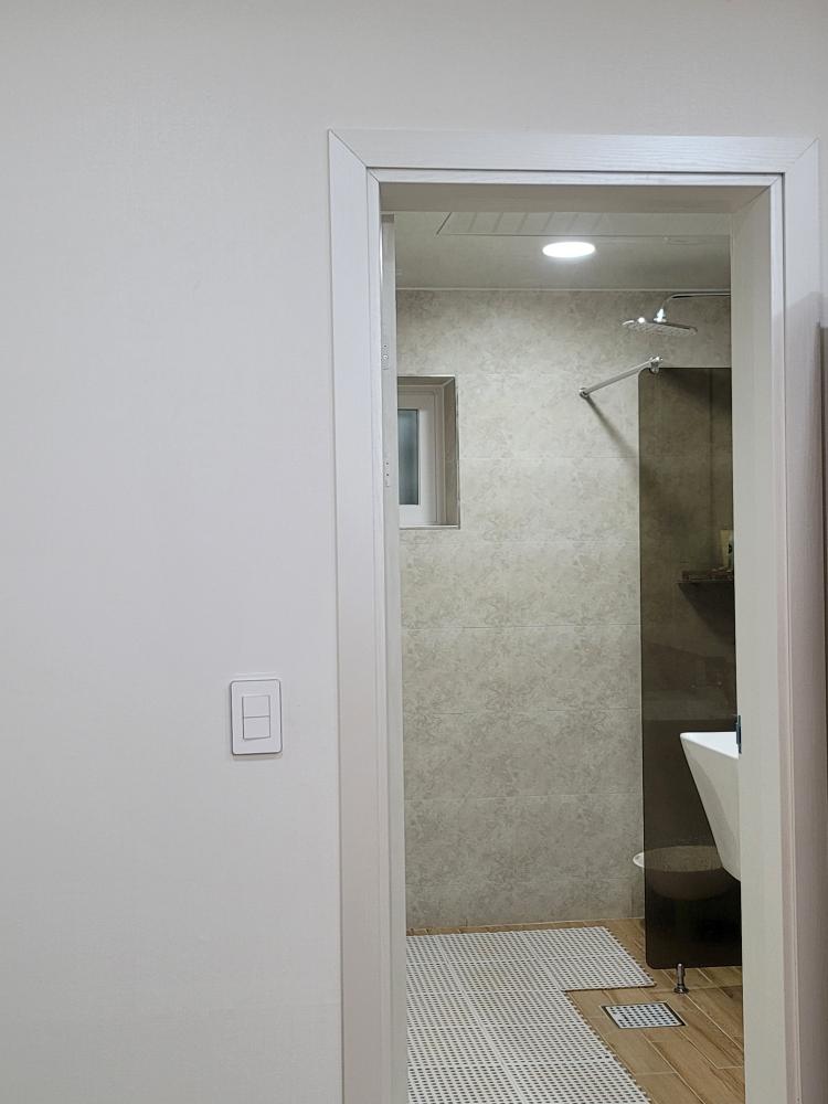 저희 가족은 5명이어서 화장실이 두 개는 필요하거든요. 그래서 하나의 거실 화장실을 두 개로 구조 변경해서 안방 벽 쪽에 문을 냈어요.