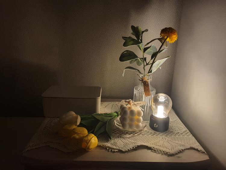 최종적으로 이렇게 완성이 되었답니다. 저 감성 전구는 정말 신의 한 수에요! 한껏 공간을 알차게 만들어주는 느낌이에요