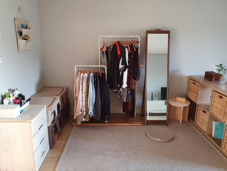 이전에 살았던 집에는 옷장이 있었는데 집이 너무 답답해 보이더라고요. 그래서 이번 집에는 옷장을 들이지 않고 대신 베란다에 봉을 설치해서 부족한 옷 수납을 해결했어요.
