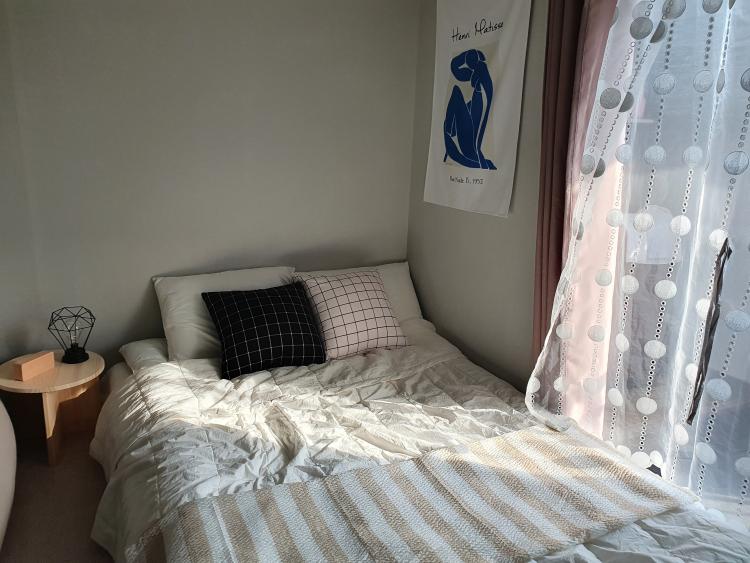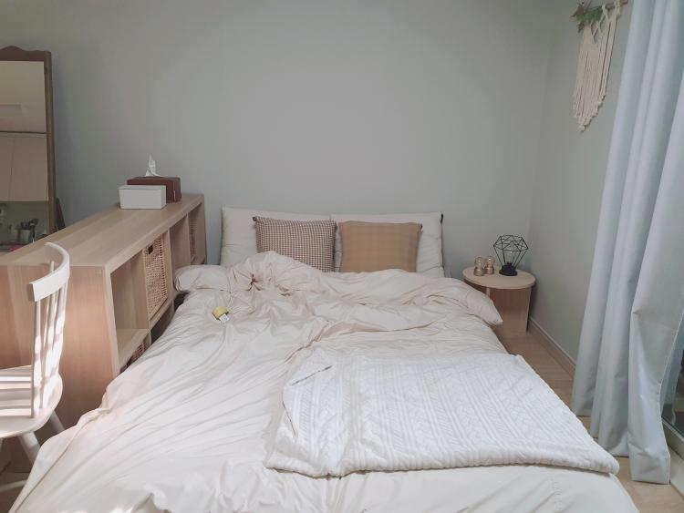 이쁘고 감성적인 침실을 담아내고 싶었는데 적나라하게 드러난 현실적인 침실이네요. 저는 좁은 침대에 자는 게 불편해서 다른 공간이 좁아질지라도 침대는 꼭 커야만 했어요.