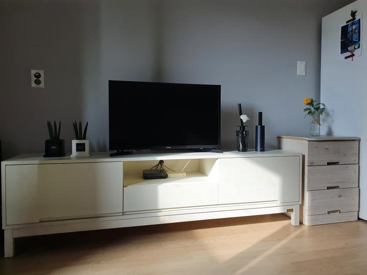 최종적으로 지금까지 만족하며 유지하고 있는 모습이에요! 단점이 있다면 전신 거울을 보면서 옷 매무새를 다듬을 때 정도랄까. 딱 침대에서 티비를 볼 수 있는 최적의 위치고 또 밥 먹으면서 티비를 보고 싶으면 티비를 살짝 돌려서 보면 되구요. 정말 만족하고 있습니다!