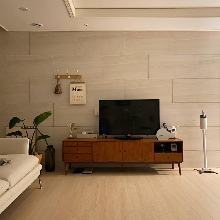 TV를 올려두지 않아도 사이드보드 역할로 손색 없는 장, 거실의 화이트 톤과 어우러지게 적당히 어두운 우드톤 색감을 고르느라 한참 여러 가지 제품을 보고 난 뒤 결정했던 아이에요.