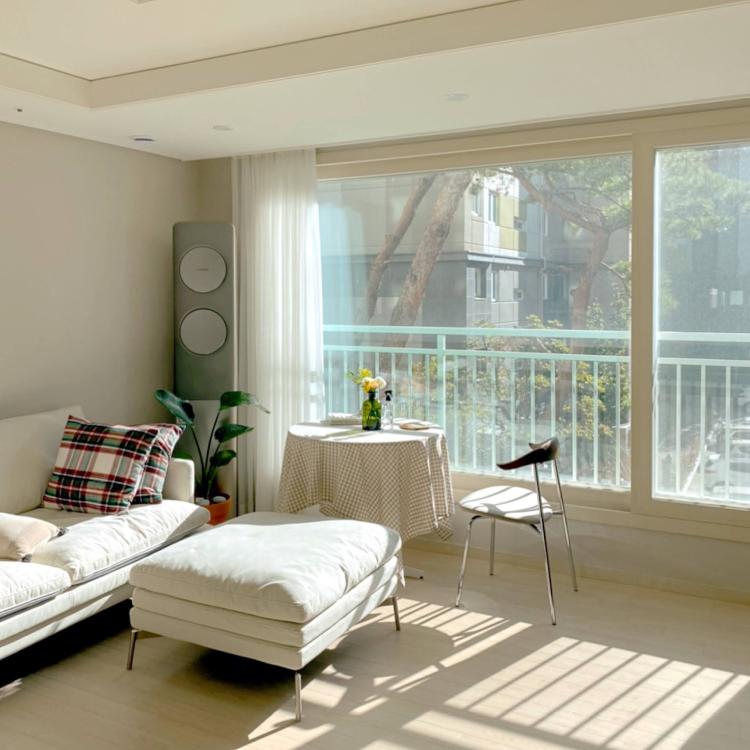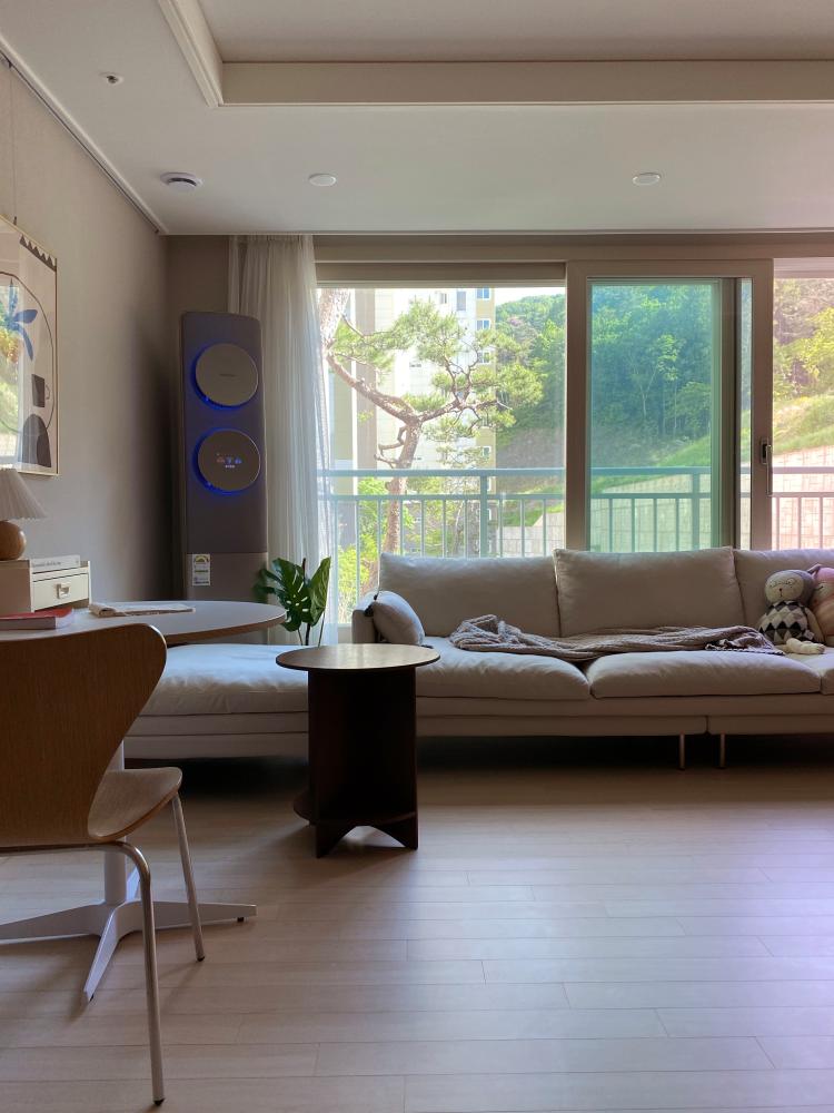 거실 창으론 사계절의 변화가 느껴지는 산과 함께 소나무가 보여요. 혼자 소파에 누워 이 소나무를 바라보는 시간을 좋아합니다 :)