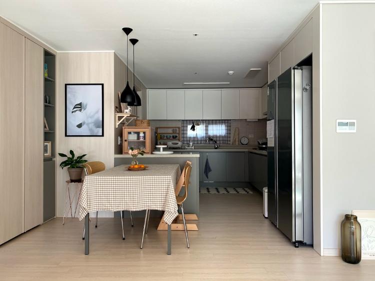 전체적으로 ㄱ자 형태의 싱크대가 있고 조리공간 옆으로 키 큰 장과 냉장고가 자리하고 있어요. 맞은편으로 식탁과 팬트리가 있답니다!